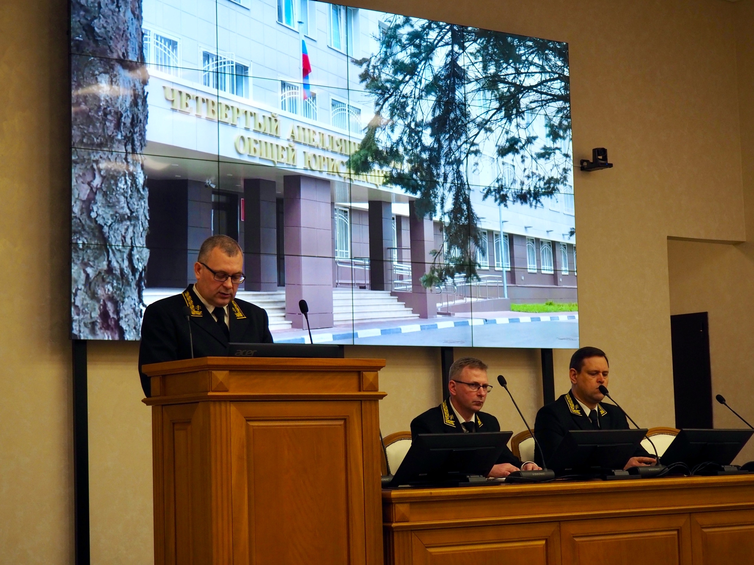 С отчётами о деятельности судебных коллегий выступили: заместитель председателя суда Николай Геннадьевич Волков; исполняющий обязанности председателя судебной коллегии по административным делам Михаил Сергеевич Сорокин; исполняющий обязанности председателя судебной коллегии по гражданским делам Владимир Александрович Кузьмичев.